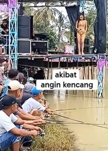 Menurut Akun kolenel_cilok, bahwa panggung diterjang angin kencang, untung saja penyayi tidak ke bawah air sungai.